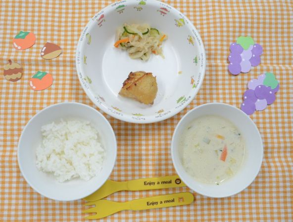 白飯、豆乳スープ、鶏肉の甘辛煮、切干大根サラダ