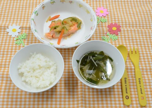 白飯、すまし汁、鮭のちゃんちゃん焼き