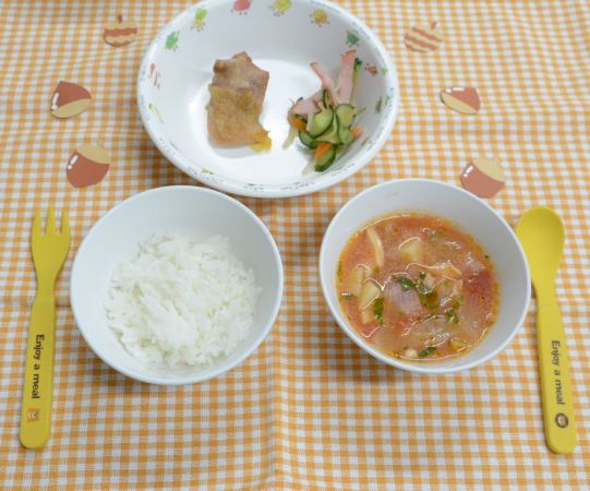 白飯、ミネストローネ、鶏のマーマレード焼き、ナムル