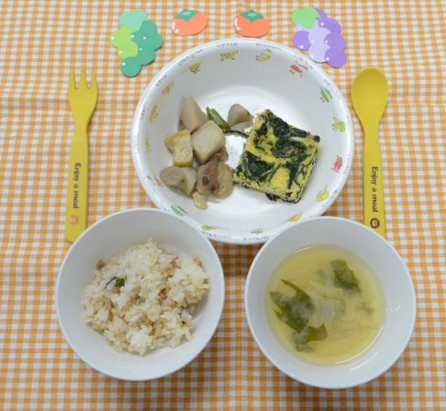 シーチキンご飯、みそ汁、筑前煮、ひじき入り卵焼き