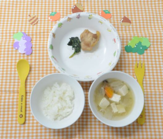 白飯、豚汁、鶏のさっぱり煮、ほうれん草のお浸し