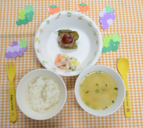 白飯、みそ汁、ピーマンの肉詰め、ポテトサラダ