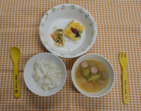麦ごはん、ポトフ風スープ、スペイン風オムレツ、レモン酢和え
