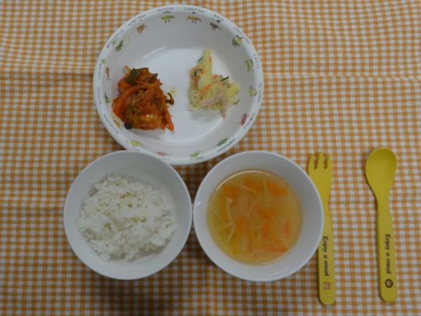 麦ごはん、オニオンスープ、鶏肉のケチャップ煮、マカロニサラダ