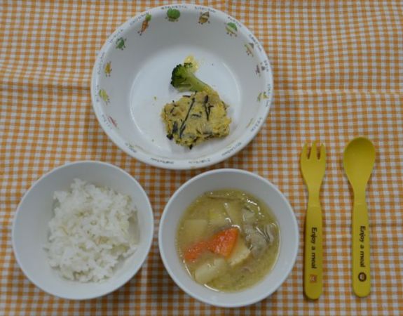 麦ごはん、豚汁、千草焼き、ブロッコリー