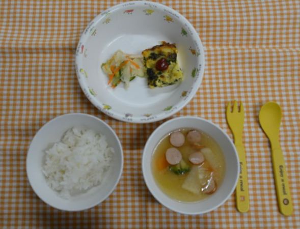 麦ごはん、ポトフ風スープ、スペイン風オムレツ、レモン酢和え