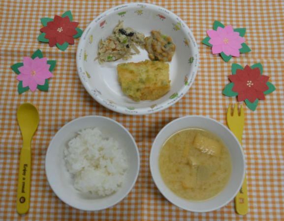 白飯、みそ汁、魚の竜田揚げ、納豆和え、うの花の炒り煮