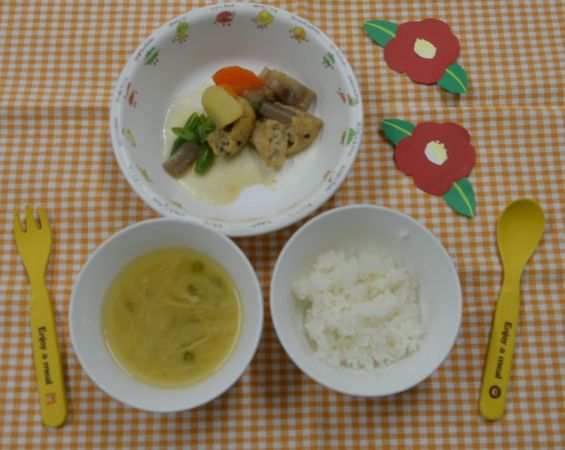 白飯、みそ汁、がんもどきのうま煮、