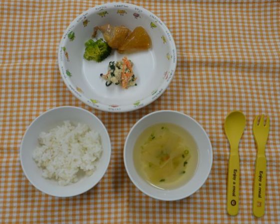 麦ごはん、清汁、鶏肉のさっぱり煮、白和え