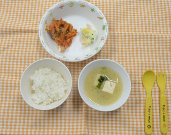 麦ごはん、みそ汁、豚肉のケチャップ煮、ポテトサラダ