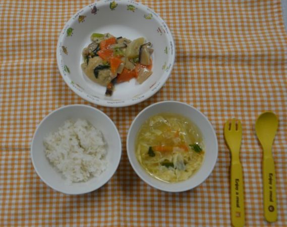 麦ごはん、むらくも汁、がんもどきの中華風うま煮