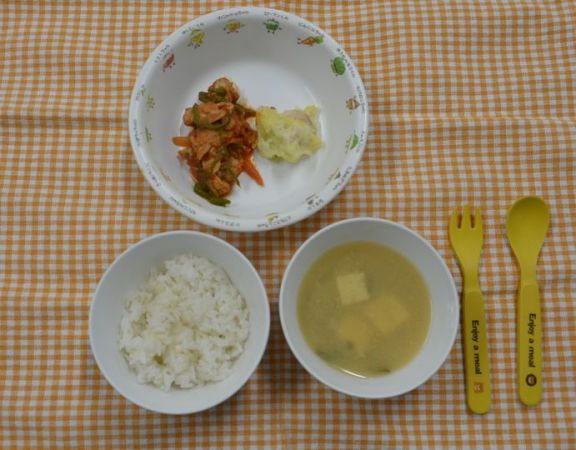 麦ごはん、豚肉のケチャップ煮、ポテトサラダ