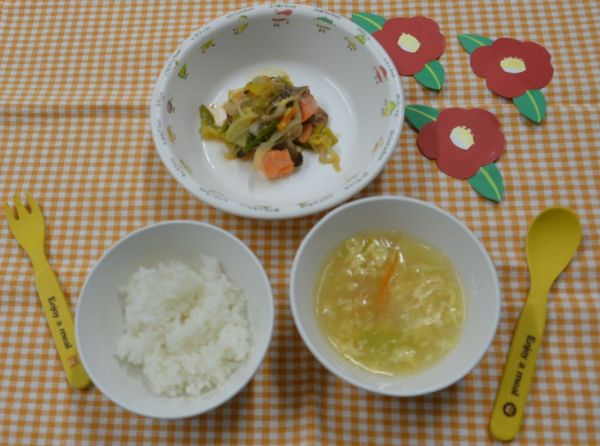 白飯、むらくも汁、鮭のちゃんちゃん焼き