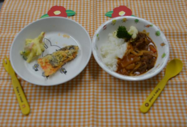 ハヤシライス、鮭のパン粉焼き、マカロニサラダ