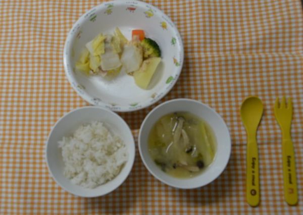 麦ごはん、みそ汁、白菜と豚肉の重ね煮、温野菜サラダ