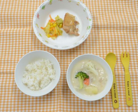 麦ごはん、クリームシチュー、ローストチキン、キャベツソテー