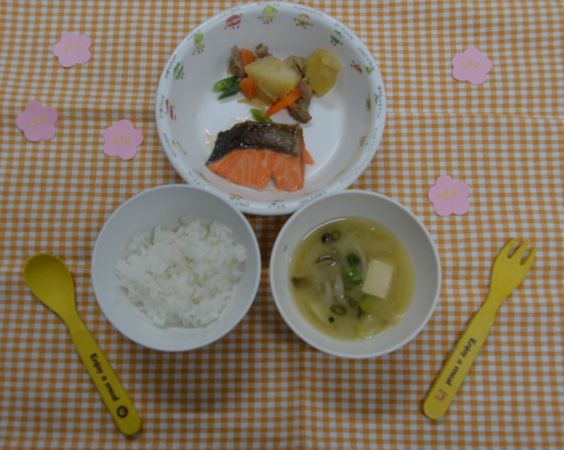白飯、みそ汁、肉じゃが、鮭の塩焼き