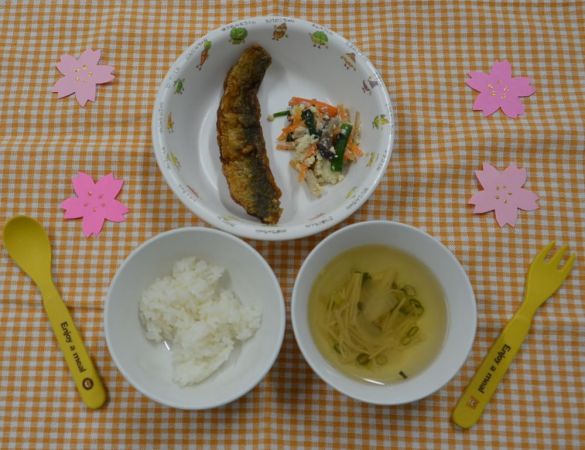 白飯、すまし汁、魚のかば焼き、白和え