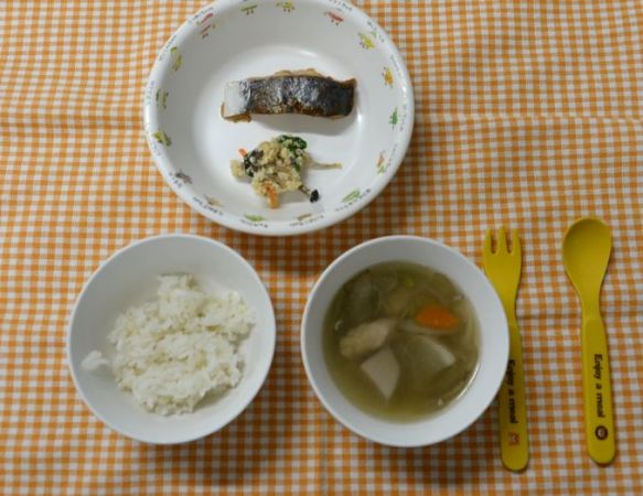 麦ごはん、具沢山すまし汁、魚の幽庵焼き、白和え