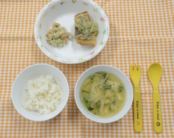 麦ごはん、具沢山みそ汁、魚のおろし煮、うの花の炒り煮
