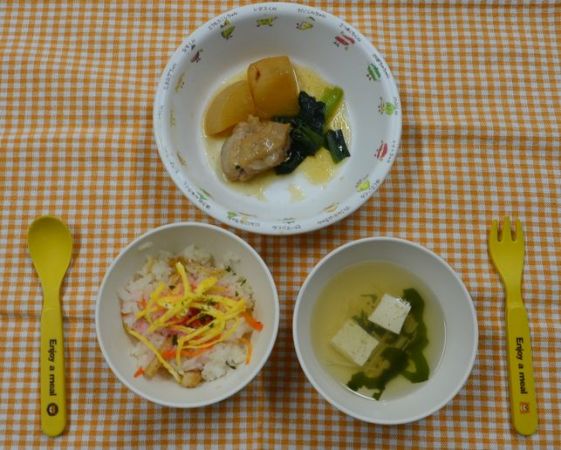 ちらし寿司、すまし汁、鶏肉のサッパリ煮