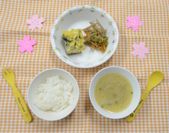白飯、みそ汁、ひじき入り卵焼き、栄養きんぴら