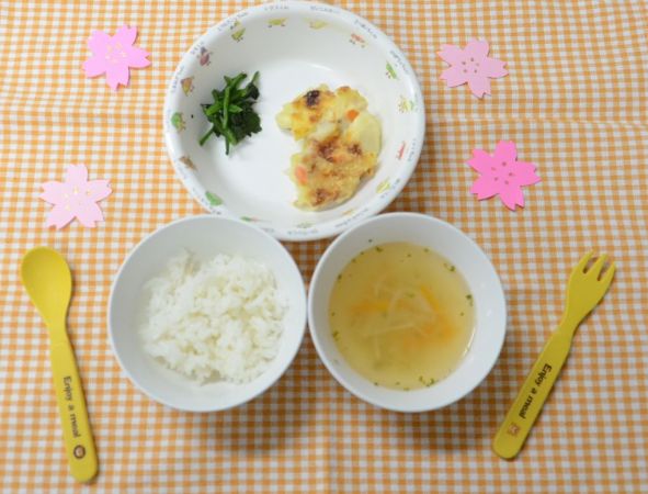 白飯、オニオンスープ、マカロニグラタン