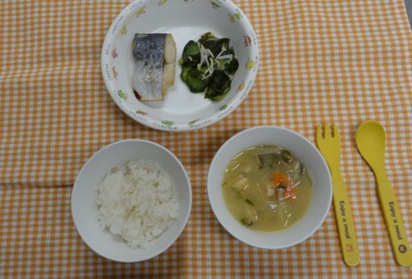 麦ごはん、みそ汁、魚の幽庵焼き、きゅうりの酢の物