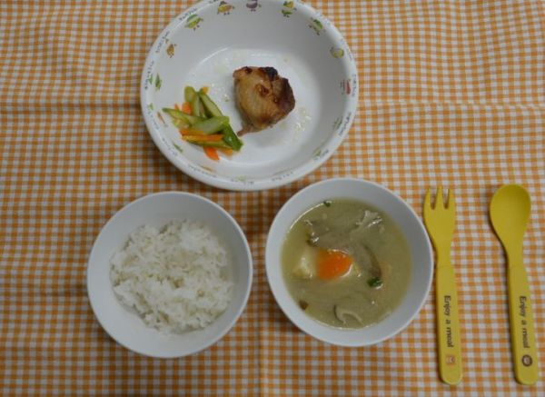 麦ごはん、豚汁、鶏肉のレモン焼き、アスパラソテー