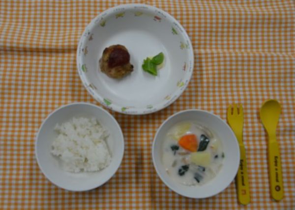 麦ごはん、チャウダー、ハンバーグ、スナップエンドウ