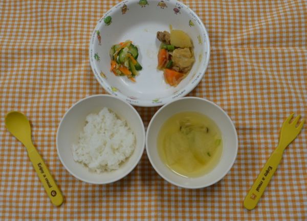 白飯、味噌汁、うま煮、レモン酢和え