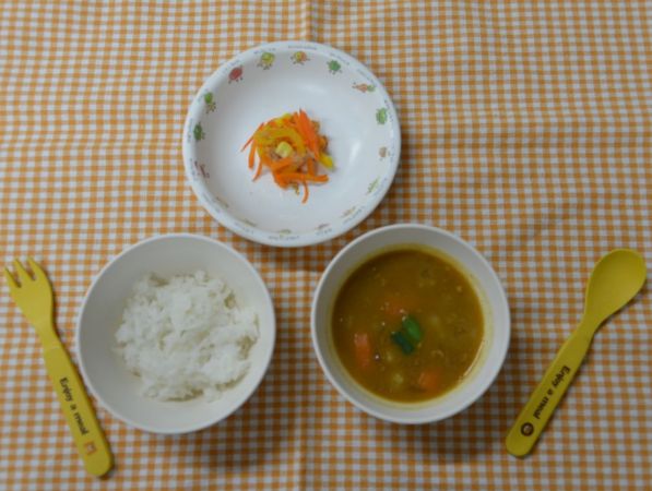 白飯、カレー煮、人参のコールスロー風