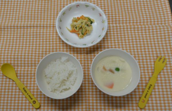 白飯、チキンクリームシチュー、切干大根の味噌マヨネーズ和え