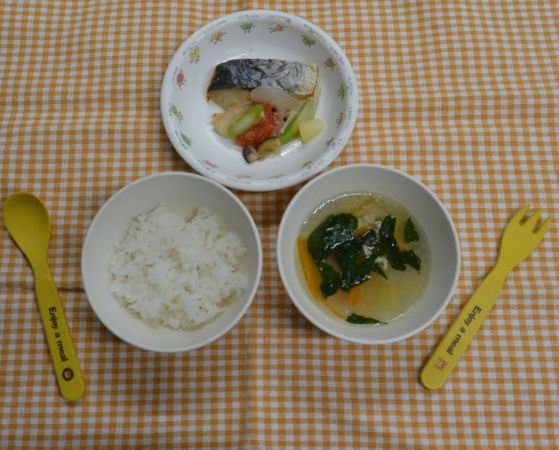 白飯、青菜スープ、いろいろ野菜と魚のオーブン焼き