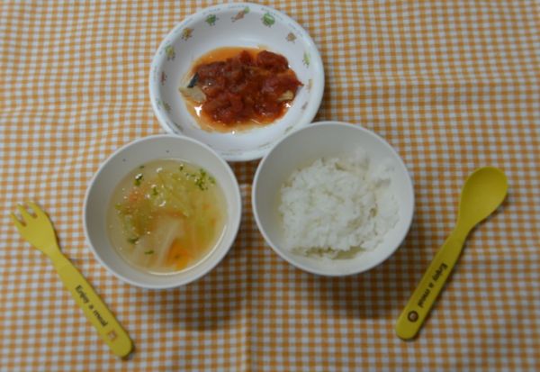 白飯、キャベツとベーコンのスープ、魚のトマトソース焼き