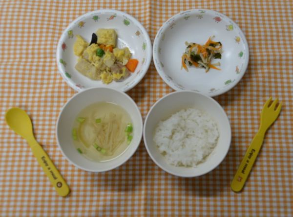 白飯、清汁、高野豆腐の八目煮、わかめのごま酢和え