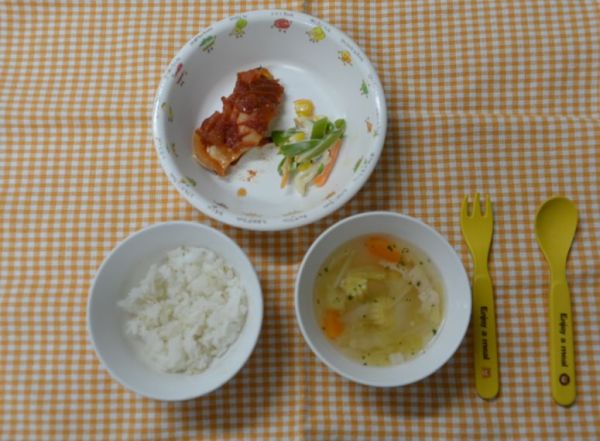 麦ごはん、キャベツのスープ、魚のトマトソース煮、スナップエンドウのごま和え