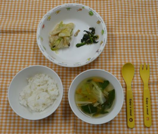 麦ごはん、青梗菜のスープ、魚のオーブン焼き、青菜のごま和え