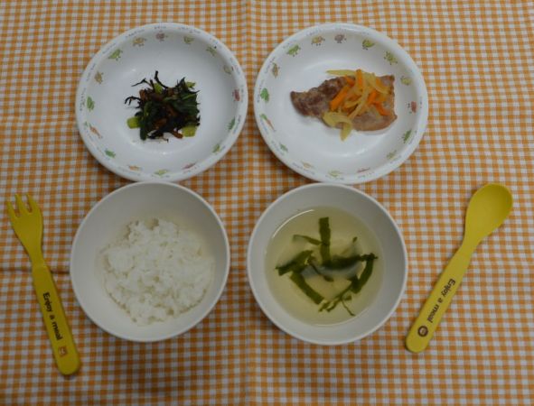 白飯、清汁、豚の生姜焼き、小松菜とひじきのごま和え
