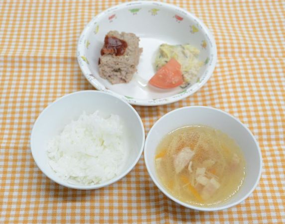 白飯、コンソメスープ、ミートローフ、ヨーグルトサラダ