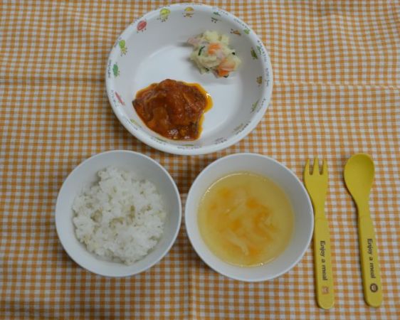 麦ごはん、コンソメスープ、煮込みハンバーグ、ポテトサラダ