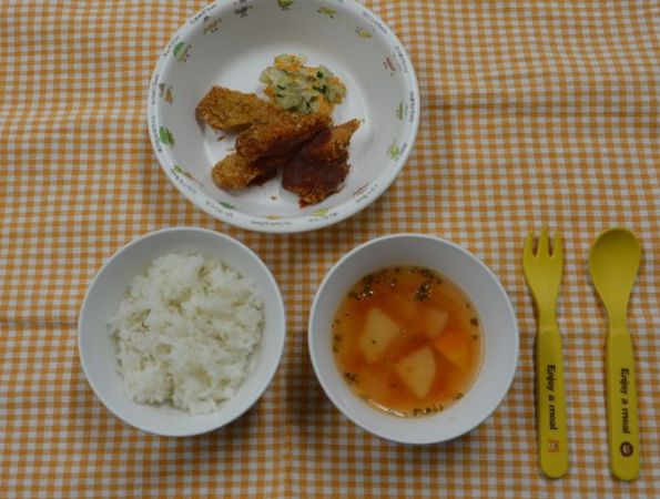 麦ごはん、トマトスープ、豚肉のミルフィーユカツ、ごまマヨサラダ