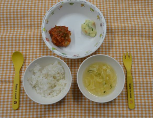 麦ごはん、中華スープ、豚肉のケチャップ煮、ポテトサラダ