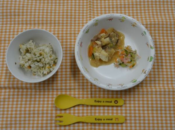 わかめご飯、野菜たっぷり肉豆腐、切干大根サラダ