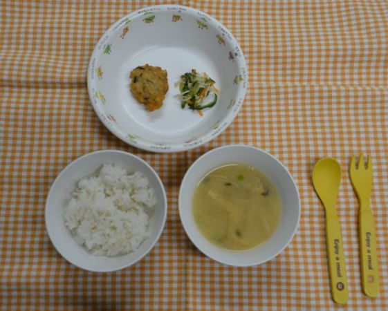 麦ごはん、味噌汁、豆腐の五目揚げ、中華風サラダ