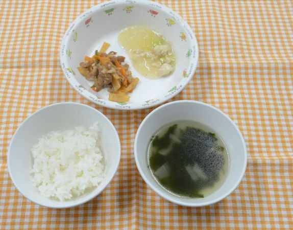 白飯、わかめスープ、チンジャオロース、冬瓜のそぼろ煮
