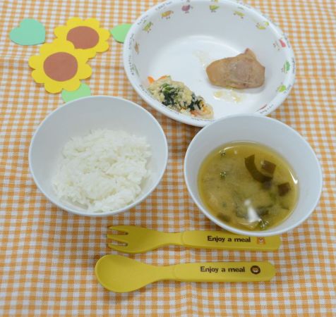 白飯、なすのみそ汁、鶏の甘辛煮、白和え