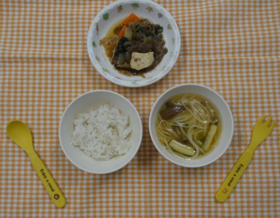 麦ごはん、みそ汁、すき焼き風煮