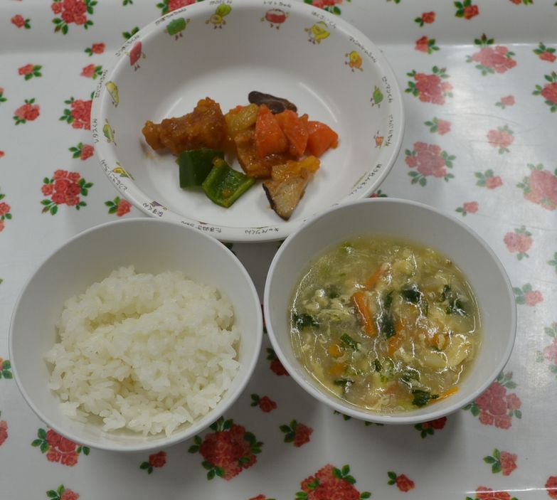 白飯、かきたま汁、酢豚