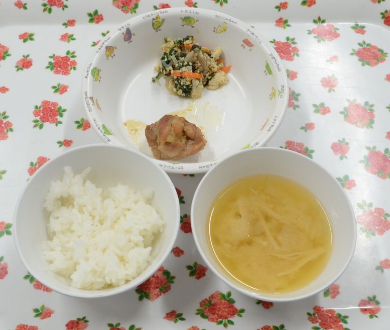 白飯、みそ汁、鶏の甘辛煮、白和え